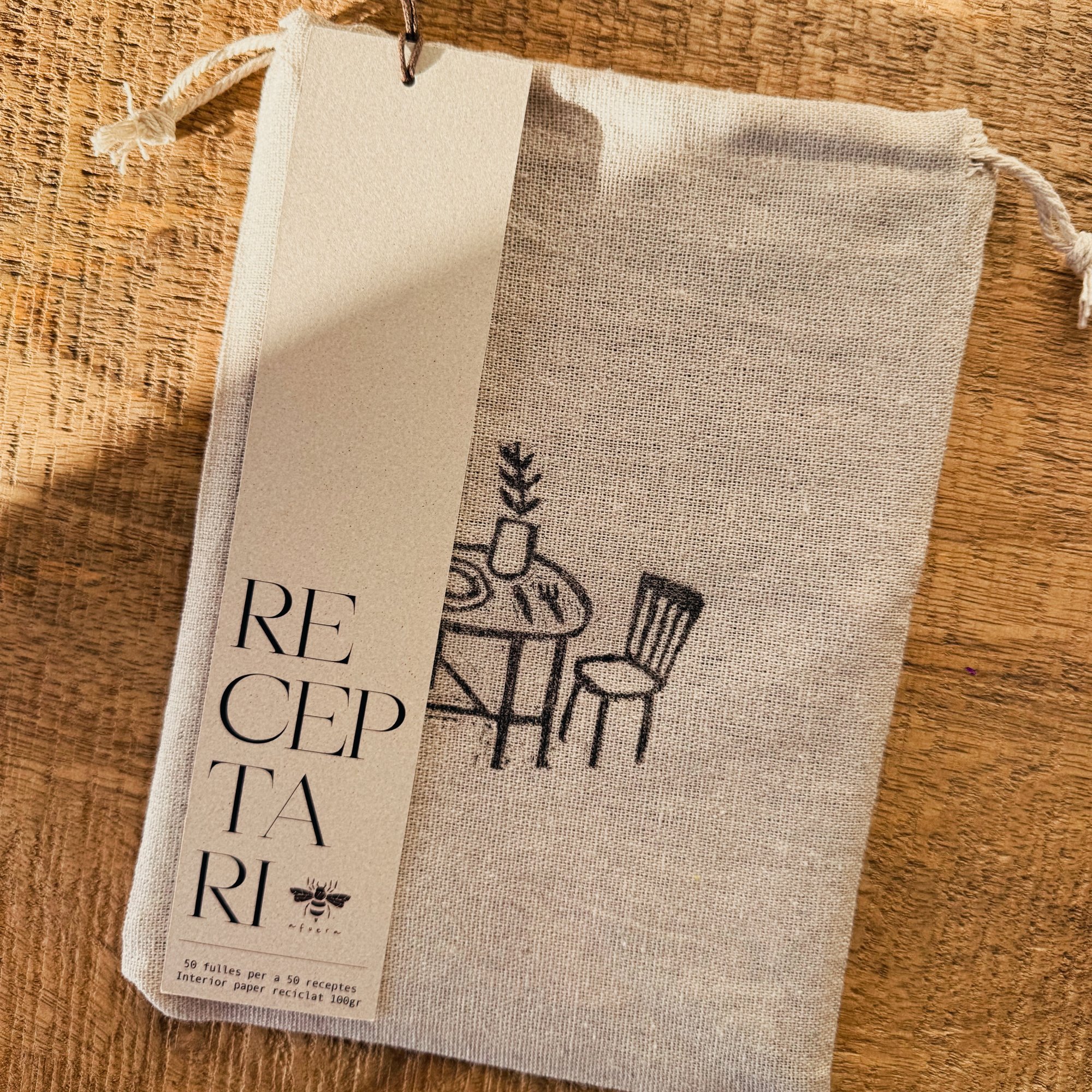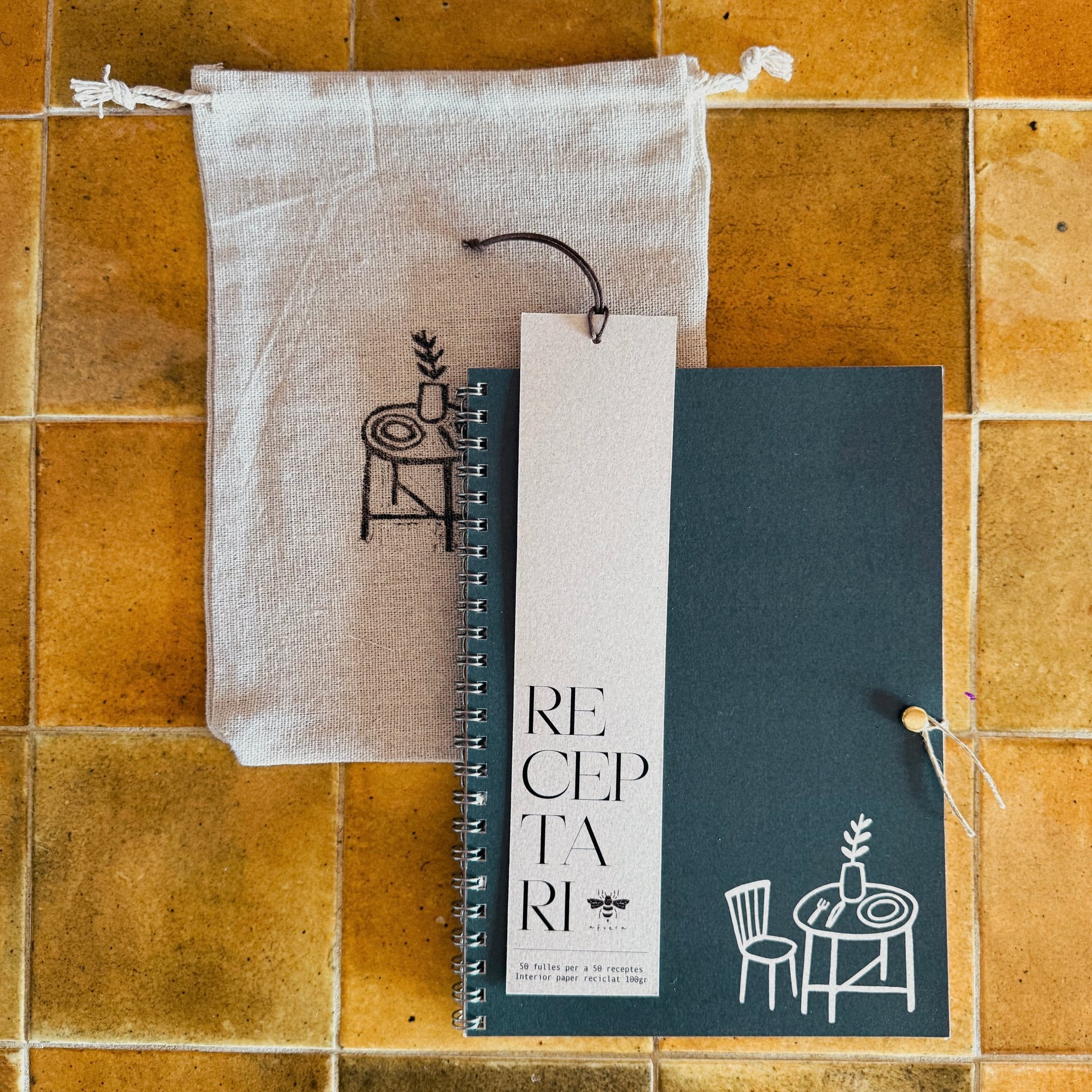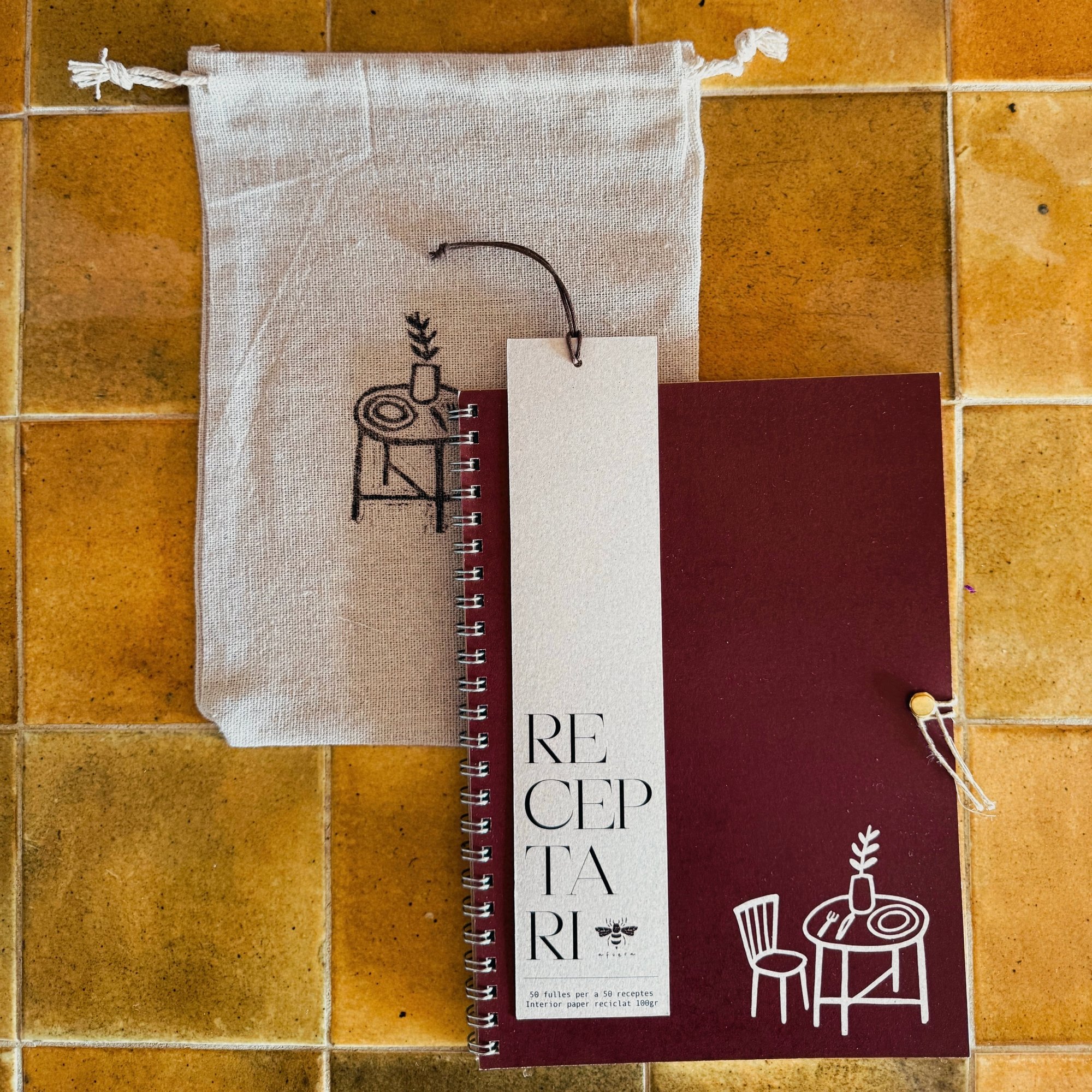 Bossa de tela estampada a mà — Una bossa pensada per guardar el receptari amb cura dins el calaix. Cada estampat és únic i aporta un toc especial al conjunt